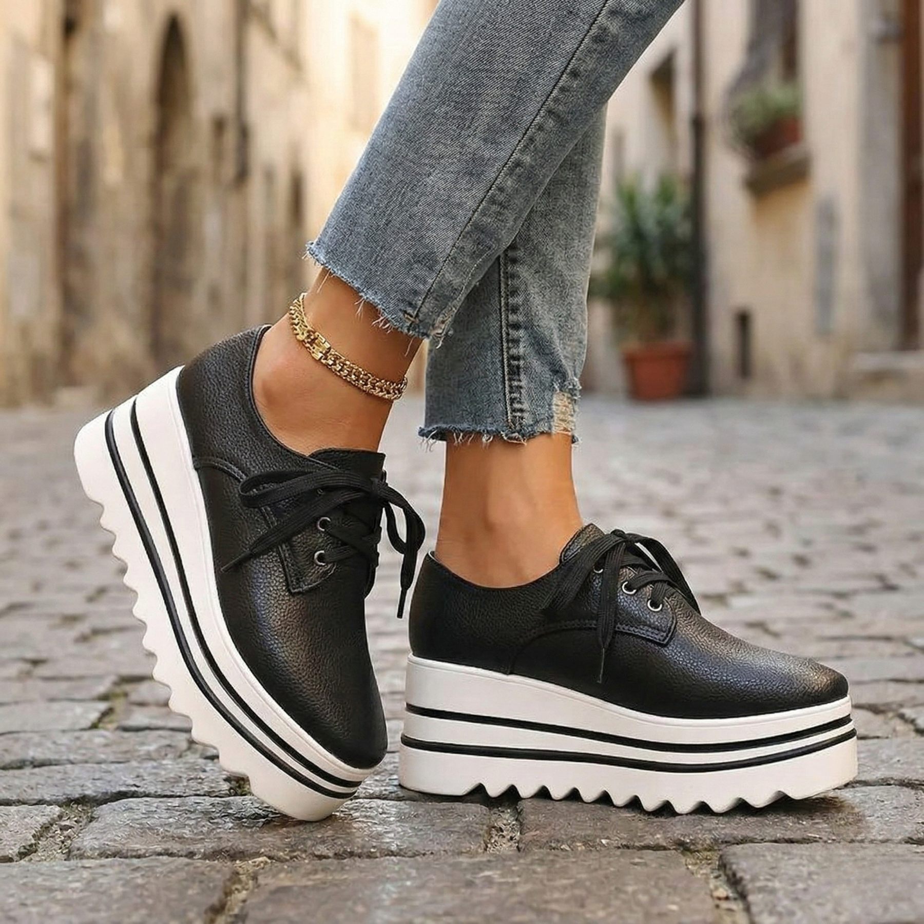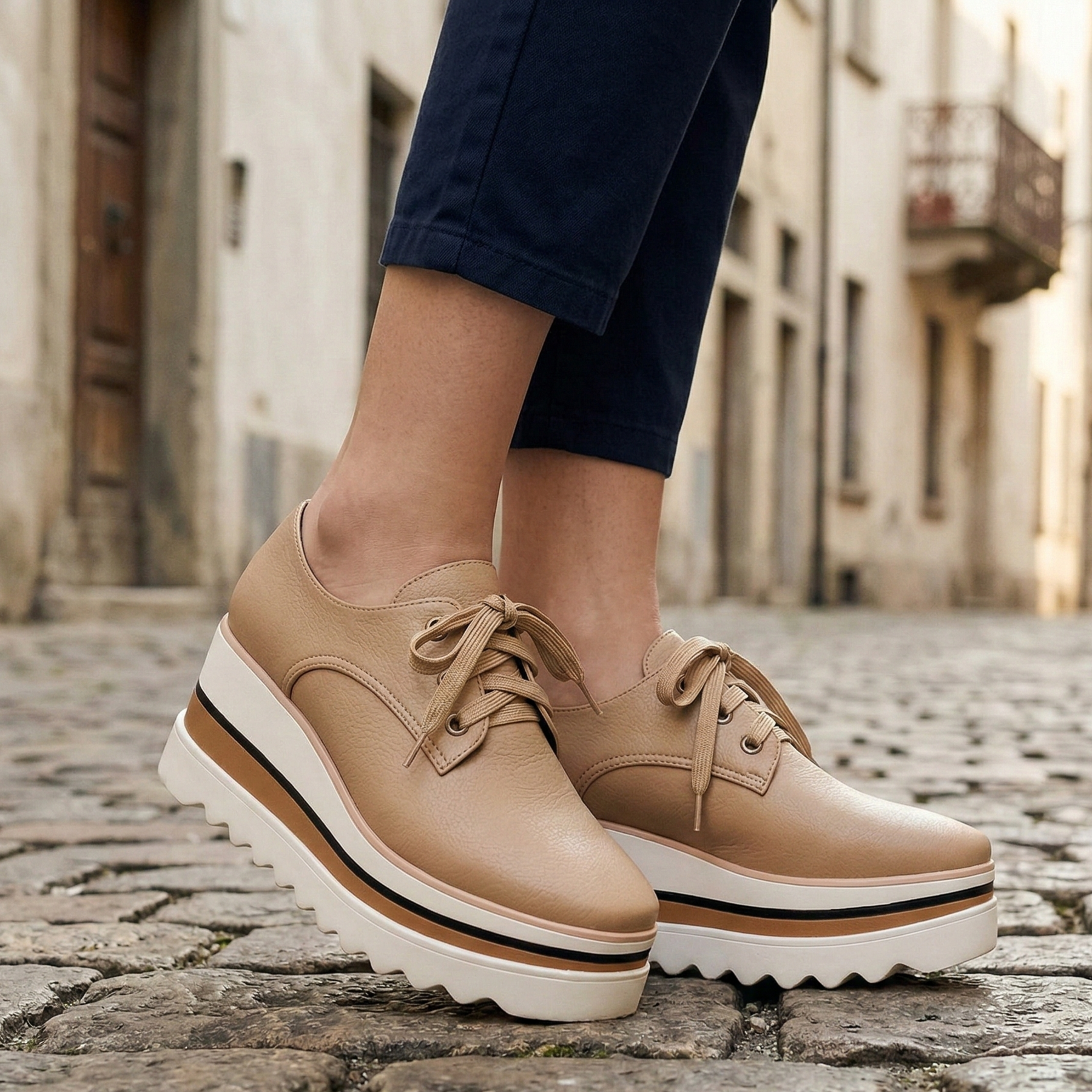 Designed with a layered chunky platform sole and textured outsole, these shoes provide added height and stable traction. Suitable for everyday wear, office settings, and smart-casual styling.